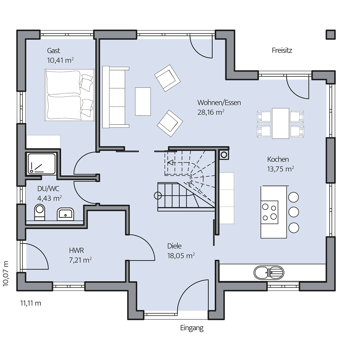 Stilvoll und durchdacht geht es auch im Inneren auf 154 m² weiter. Das urgemütliche Wohnambiente präsentiert sich offen, jedoch nicht zu weitläufig. Praktische Nebenräume, behagliche Nischen, eine durchdachte Aufteilung für kurze Wege und nicht zuletzt die Sauna unter dem Dach machen ein flexibles, komfortables Familienleben möglich. Der Hauswirtschaftsraum bietet ausreichend Platz für die Haustechnik, so dass kein Keller notwendig ist. Eine kostensparende Sole-Wasser-Wärmepumpe speist die Fußbodenheizung. Und auch über die Technik hinaus wurde an später gedacht: Das Gästezimmer mit dazugehörigem Dusch-WC im Erdgeschoss ermöglicht im Alter ohne großen Aufwand das Leben auf einer Ebene