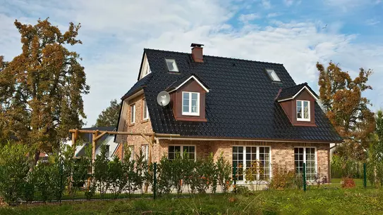 In diesem behaglichen Heim fühlen sich Groß und Klein rundum wohl ohne Kompromisse eingehen zu müssen. Denn das Haus der Familie Denker ist ein vollendeter Mix aus norddeutscher Gemütlichkeit mit modernstem Komfort. Mit dem bunten Verblendmauerwerk unter dem glänzend-schwarzen Krüppelwalmdach, den von zwei Gauben flankierten Zwerchgiebeln, den weißen Sprossenfenstern und der kunstvoll gearbeiteten Eingangstür ist das Haus ein Schmuckstück in der Landschaft. Es bietet großzügige Glasflächen, einen überdachten Freisitz und eine große Terrasse.