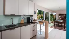 Das individuelle Zuhause der Familie Dietz präsentiert sich den begeisterten Betrachtern mal als Pultdachhaus, mal als Kubus. Die schlichte Linienführung mit der weißen Fassade, den schlanken Fenstern und der Übereck-Verglasung hin zum Garten, zeigen, dass weniger manchmal umso mehr ist. Die Eingangsüberdachung verläuft durchdacht in ein Carport aus, vom dahinterliegenden geschlossenen Geräteraum führt eine Tür direkt in den Garten. Im Innenraum des imposanten Hauses führt die Diele großzügig in den ruhig gelegenen Wohnbereich sowie in die Essecke mit Blick in den Garten. Auch das geradeläufige, aus Holzstäben in stark variierenden Farben verleimte Faltwerk wurde in den Wohnbereich integriert, die violette Wand dahinter setzt einen gekonnten Farbakzent. Im Obergeschoss fügen sich das Elternzimmer mit seiner Ankleide und dem eigenen Bad sowie zwei Abstellräume und Kinderzimmer mit Kinderbad optimal in den Neigungswinkel des Pultdaches ein.
