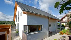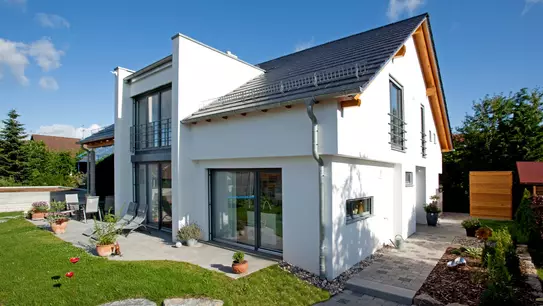 Das Gebäude öffnet sich mit einem nach Süden orientierten Erker, der über zwei Geschosse zu jeder Tageszeit eine tolle Belichtung ermöglicht. Nahezu verschwenderisch sind im Dachgeschoss zwei Schlafräume mit je separat zugänglichem Bad angeordnet. Das Erdgeschoss beherbergt einen leicht zurückliegenden Wohnbereich, so dass die Küche und der Essbereich in klarem Zusammenhang stehen. Der gut geschnittene Windfang wird durch eine deckenhohe Glasschiebetür vom inneren Flurbereich getrennt. Die Vor- und Rücksprünge am Gebäude sind wohlproportioniert und runden das harmonische Bild der modernen Bauweise ab.