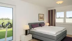 Haus Zumstein nutzt gekonnt alle Möglichkeiten des modernen Baustils. Etwa in der Fassadengestaltung unter dem versetzten Pultdach – mit einem Mix aus weißem Putz, einem erdtonfarbenen Ziermauerwerk an einer Giebelhälfte, hellgrauen Blenden und anthrazitfarbenen Fenstern und Türen. So auch in der Form der Fassade durch ihre versetzten Elemente und Vorsprünge. Und vor allem mit der Positionierung der Fensterflächen, die von klein bis groß und von rund bis eckig ein absolut stimmiges Arrangement ergeben. Haus Zumstein ist ein eingeschossiges Einfamilienhaus mit einer Wohnfläche von über 141 m². Ergänzt wird es durch eine Garage, die einen direkten Zugang zum Hauswirtschaftsraum und so in die Diele mit angrenzendem Gäste-WC bietet. Ein Highlight des Hauses sind ganz sicher die großen Fensterflächen im Essbereich, die bis unter das Dach reichen. Vom großen Lichteinfall profitieren auch Wohnzimmer und Küche. Das Schlafzimmer ist durch einen Flur vom Hauptwohnbereich getrennt und bietet so viel Ruhe. Ihm angrenzend liegen das Hauptbad mit Badewanne und ebenerdiger Dusche sowie ein weiteres Zimmer für ein Kind, für Gäste, ein Büro, das Hobby oder einfach als Rückzugsort.
